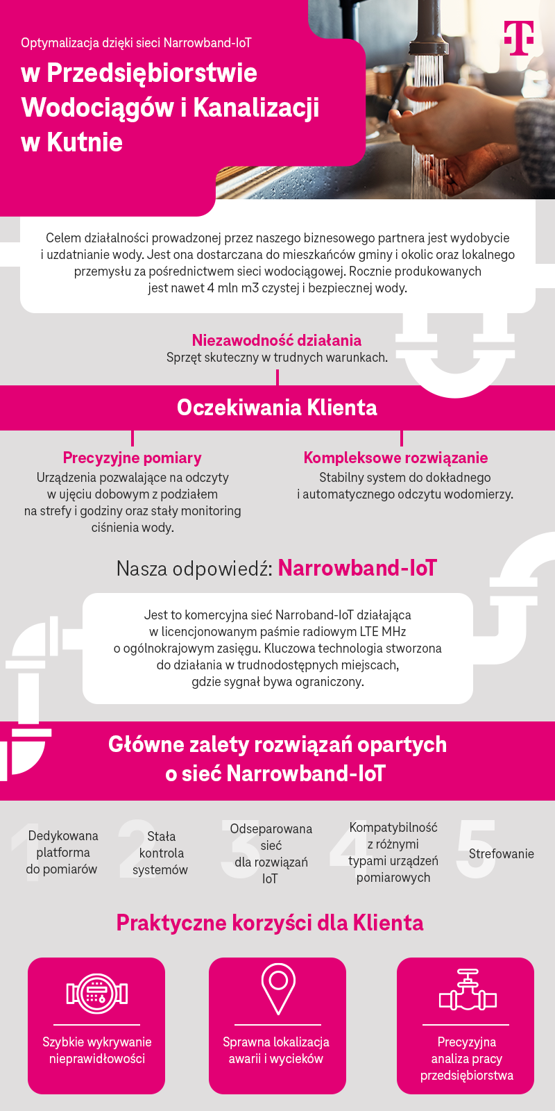 W 2015 roku firma rozpoczęła modernizację systemów zdalnych odczytów i wdrażanie nowych technologii na sieci kanalizacyjnej i wodociągowej. Na jednym z etapów zdecydowała się na wykorzystanie rozwiązania Narrowband-IoT od T-Mobile.