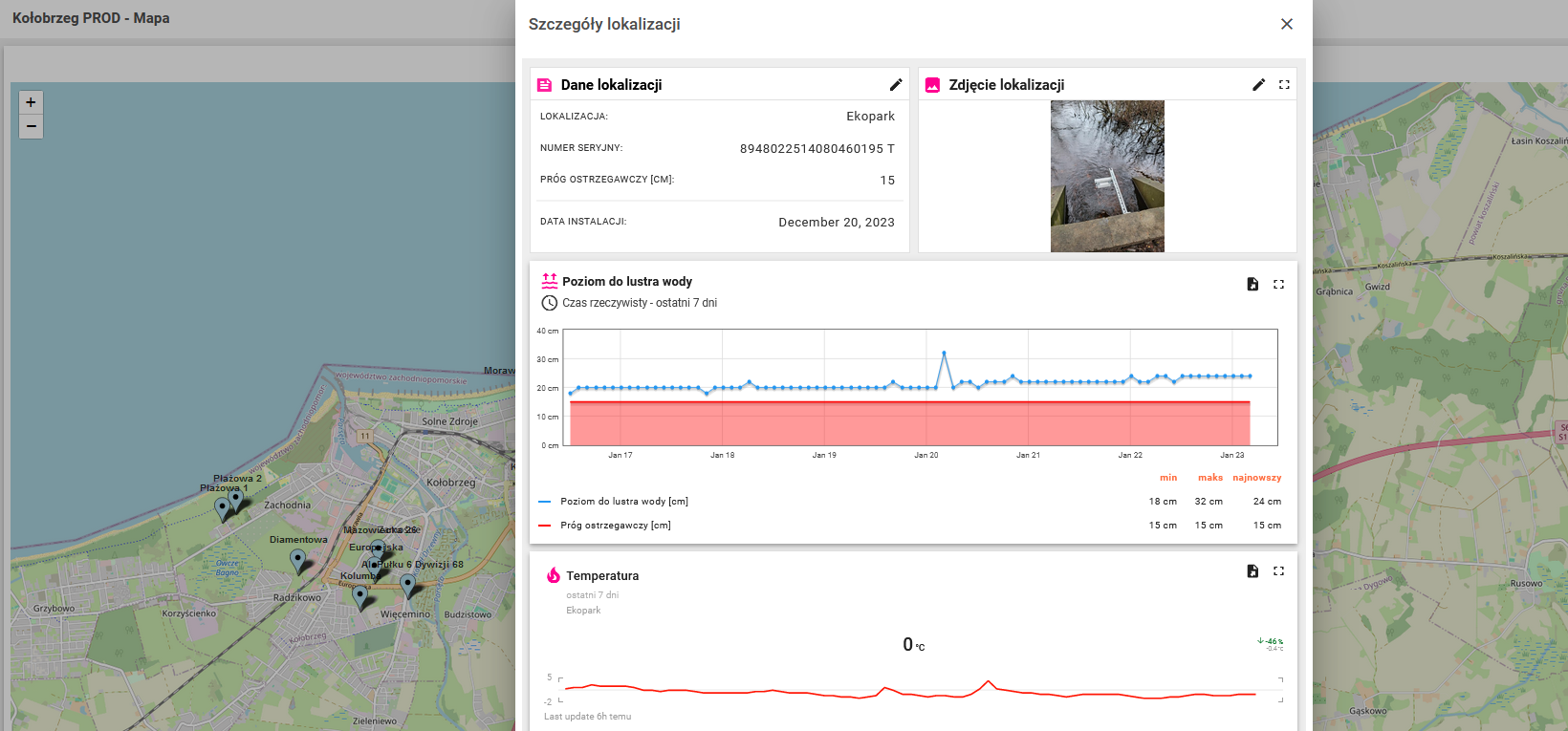 System wizualizacji danych pomiarowych*, prezentujący w czasie rzeczywistym poziom lustra wody, próg ostrzegawczy oraz temperaturę otoczenia z każdego zainstalowanego urządzenia.